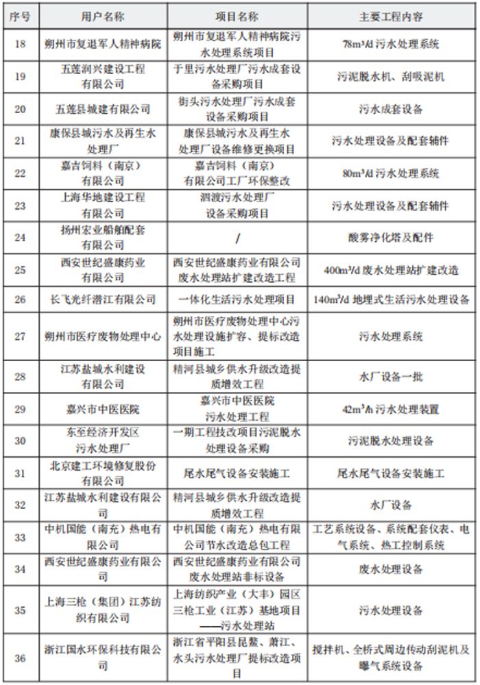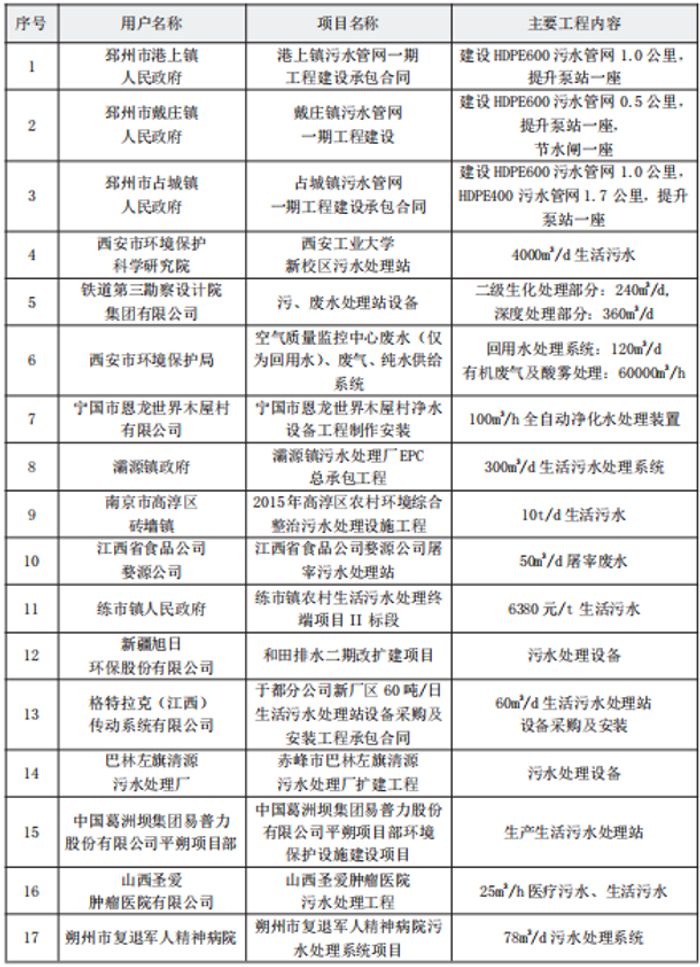 市政及其他污水项目业绩表